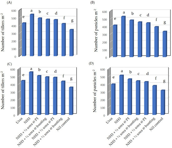 Rice number of tillers (A,C) and panicles (B,D) as affected by the different N-treatments described in Table 1 for the seasons 2017 and 2018, respectively. Values followed by different letters (a, b, c, d, e, f, g) are significantly different according to Duncan’s significant difference P < 0.05.