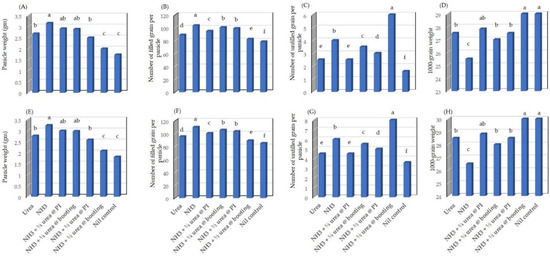 Yield related attributes as affected by the different N-treatments described in Table 1: (A,E): panicle weight; (B,F): number of field grain per panicle (g m−2); (C,G): number of unfilled grains per panicle; and (D,H): 1000-grain weight (g) for the seasons 2017 and 2018, respectively. Values followed by different letters (a, b, c, d, e, f, g) are significantly different according to Duncan’s significant difference P < 0.05.