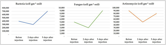 The existence of a designated treatment that could increase yield and net income for the farmers without side effects on the environment is the key for sustainable agriculture. For this reason, the soil bacteria, fungi and actinomycetes populations were counted in the soil treated with a full dose of anhydrous ammonia. The results indicate that there was a resurgence in the counts of the measured microorganisms. The decrease after 2 days of injection could be attributed to the effect of ammonia, increase in pH and increase in ionic concentration as previously reported by [33,34]. The resurgence in their counts after 5 days could be explained to the rebuilding ability of the microorganisms’ populations from the unaffected adjacent area.