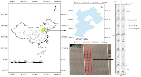 The experiment was conducted from 1 October 2019 to 1 March 2020 at Nanpi Eco-Agricultural Experimental Station of Chinese Academy of Sciences, Hebei province, China (116°40′ E, 38°00′ N, 11 m above sea level). The study area has a warm temperate semi-humid continental monsoon climate. The long-term (1953–2018) mean annual air temperature is 12.3 °C, with the lowest monthly temperature of −7.9 °C in January and the highest equals to 22.4 °C in July. Mean annual precipitation is about 480 mm, most of which falls between July and September and only 2% of which falls in winter. The soil in this area generally starts to freeze in November and thaw in March, and the maximum freezing depth is about 30–40 cm (data sourced from the National Meteorological Information Center, http://data.cma.cn (accessed on 1 September 2019)). The soil is classified as chestnut soil and basic physicochemical characteristics are shown in Table 1. For the general soil analysis, soil samples (0–60 cm) were taken from the experiment field with three replications before the experiment began.