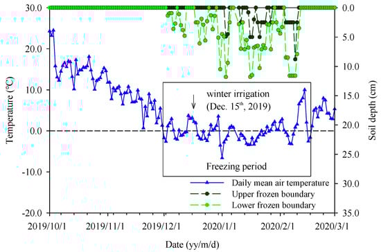 During the field experimental period from 1 October 2019 to 1 March 2020, air temperature varied in the range of −6.6 to 24.1 °C, presenting a parabolic trend (Figure 2). On 30 November 2019, the daily air temperature was below 0 °C for the first time and subsequently the air temperature decreased in a fluctuating way. The minimum daily air temperature was −6.60 °C on 11 February 2020. After 18 February 2020, daily air temperature was steadily higher than 0 °C. The freezing period was from 30 November 2019 to 18 February 2020, and during the most time of the freezing period, the daytime temperature stayed above 0 °C, and dropped below 0 °C at night. The statistical results showed that the winter of 2019 was the second warmest winter at the experiment site with a negative accumulated temperature of −64.6 °C, compared to the long time mean negative accumulated temperature of −228.32 °C (1960–2019). Total precipitation was 24.3 mm from nine rainfall and two snowfall events, and the highest daily rainfall was about 7.8 mm on 15 February 2020. Due to the warm winter, there was almost no snow cover and the maximum soil frozen depth was 21 cm on 19 February 2020.