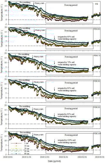 Soil temperature at 5, 10, 20, 40 and 60 cm depths from different treatments. Arrows indicate the occurrences of pre-seeding irrigation (17 October 2019), heavy rain (8 November 2019) and winter irrigation (15 December 2019). CK refers to the treatment without winter irrigation. WHC60, WHC70, WHC80, WHC90 and WHC100 refer to the treatments with winter irrigations where soil in 0–30 cm was irrigated to 60%, 70%, 80%, 90% and 100% of the soil water holding capacity on 15 December 2019, respectively.