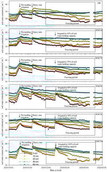 Soil water content at 5, 10, 20, 40 and 60 cm depths from different treatments. Arrows indicate the occurrences of pre-seeding irrigation (17 October 2019), heavy rain (8 November 2019) and winter irrigation (15 December 2019). CK refers to the treatment without winter irrigation. WHC60, WHC70, WHC80, WHC90 and WHC100 refer to the treatments with winter irrigations where soil in 0–30 cm was irrigated to 60%, 70%, 80%, 90% and 100% of the soil water holding capacity on 15 December 2019, respectively.