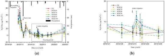 Dynamic changes of soil N2O emission in a winter wheat field (a) and a partial enlargement drawing (b). Arrows indicate the occurrences of pre-seeding irrigation (17 October 2019), heavy rain (8 November 2019) and winter irrigation (15 December 2019). The bar plot placed in the upper part is precipitation. CK refers to the treatment without winter irrigation. WHC60, WHC70, WHC80, WHC90 and WHC100 refer to the treatments with winter irrigations where soil in 0–30 cm was irrigated to 60%, 70%, 80%, 90% and 100% of the soil water holding capacity on 15 December 2019, respectively.