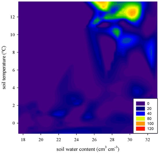 Soil moisture was one of the crucial drivers of temporal variability of soil–atmosphere N gas fluxes through the regulation of diffusion conditions, oxygen availability and the soil microbes’ respiration chain [13]. As shown in Figure 6, soil emitted more N2O when the soil water content of top soil layer ranged between 26–31 cm3·cm−3 (equivalent to 62–73% WFPS), which was in line with the results obtained by Hamamoto et al. [27], who reported that when WFPS is between 50% and 80%, high N2O emissions were measured. Hung and Whalen [28] also reported that greatest production of N2O may occur at moderate gas diffusivities (e.g., oxic zones and anoxic microsites coexisted), and excessive moisture condition, usually at >60–70% WFPS, may suppress N2O emissions due to a shift toward complete denitrification. Klefoth et al. [29] also reported almost all introduced N2O was reduced to N2 in a soil at 90% WFPS. Chen et al. [23] reported anaerobic conditions can form immediately after soil waterlogging because the O2 diffusion rate can be reduced by 10,000-fold in wet soils, and subsequently N2O was used as the electron acceptor and further reduced to N2 [30].