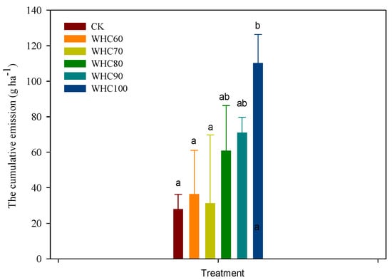 The cumulative emissions in CK and WHC60–100 from 15 December 2019 to 18 February 2020. Values with same superscript letters are of no significant difference (p > 0.05), those with different letters are of significant or extreme difference (p < 0.05). CK refers to the treatment without winter irrigation. WHC60, WHC70, WHC80, WHC90 and WHC100 refer to the treatments with winter irrigations where soil in 0–30 cm was irrigated to 60%, 70%, 80%, 90% and 100% of the soil water holding capacity on 15 December 2019, respectively.