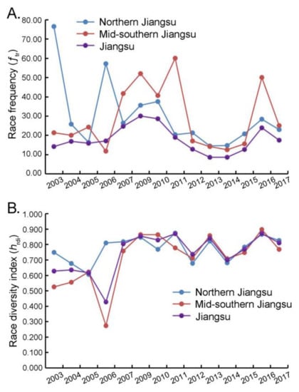 Zhang et al. reported that the number of rice cultivars grown in Heilongjiang province was the principal factor driving changes in the race structure of P. oryzae populations [22]. In Jiangsu province, there were 213 rice varieties approved for cultivation from 2003 to 2017, and 80 rice varieties were planted in Jiangsu in 2005 [27]; the numbers increased to 107 and 224 by 2010 and 2017, respectively, which included 127 in northern Jiangsu and 97 in mid-southern Jiangsu (data from Jiangsu Seed Management Station). In this study, we found that the race diversity index was not consistent with race frequency, which was presumably due to the number of isolates and the equitability of race in one year, so the race diversity index is appropriate to assess the race diversity of the P. oryzae population. Moreover, the race diversity from 2003 to 2006 decreased, and continuous fluctuations were observed from 2007 to 2017. No increases in race diversity from 2010 to 2017 were observed. We speculated that the number of rice cultivars plays a role in race diversity, but there were other reasons, such as the high homogeneity (same resistance genes) of rice varieties [23]. In the United States, a total of 1022 isolates collected from 1959 to 2015 were analyzed for pathogenicity against eight international rice cultivars, the results of which suggested that hosts are a driving force for the genetic variability of P. oryzae isolates [7]. Moreover, the genetic variability of P. oryzae isolates is also related to sexual reproduction [28,29], and we found sexual reproduction affects the genetic diversity and dissemination of P. oryzae in Jiangsu in a previous study [19].