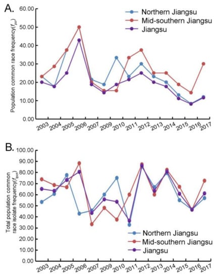 From 2003 to 2017, three races (ZB15, ZC15, and ZG1) were identified as being represented in all populations, leading to estimated ƒpcr values from 8.11% (2016) to 42.86% (2006) (Table 2). The trend of ƒpcr values declined slowly from 2007 to 2017, indicating that P. oryzae races in Jiangsu were more complex within this decade. In addition, ƒpcr values for the set of shared races varied from 1.35% (ZB15 in 2011) to 75.61% (ZG1 in 2006). The estimated ƒpcr values ranged from 36.49% (2011) to 86.17% (2012), which were at a lower level from 2007 to 2011, and fluctuated wildly from 2012 to 2017 (Figure 2, Table 2), suggesting that the common race structure fluctuated greatly on an annual basis. However, the trends of the two parameters of the northern and mid-southern Jiangsu regions were similar (Table S4). Moreover, the Chi-square analysis indicated that the total population common race isolate frequency changed significantly from 2003 to 2017.