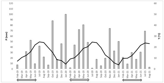 Weather conditions of the experiment period. Grey bars, total monthly precipitation (P); black line, mean monthly temperature (Tm). Arrows represent the growing season each year.