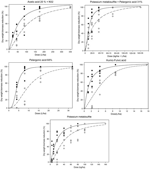 Dose–response curves of T1: acetic acid 20% + N32, T2: potassium metabisulfite + pelargonic acid 31%, T3: pelargonic acid 68%; T4: humic-fulvic acid, T6: potassium metabisulfite. Values are presented as dry weight biomass reduction (%) of the no-treated control. Black points (●) and solid lines (—), BBCH 12–13; white points (○) and dashed lines (– –), BBCH 14–15.