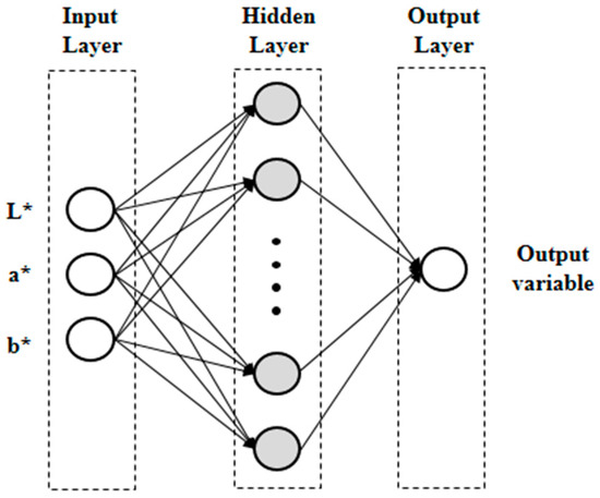 An artificial neural network (ANN) was used for predicting the quality attributes in strawberry fruit. A feed-forward architecture of ANN, known as multi-layered perceptron (MLP), with back propagation and training algorithms was employed to build predictive and non-linear models for the output variables (FF, TSS, TA, TPC, AA, TMA). It consists of one input layer with the neurons as independent variables (L*, a*, b*), one or more hidden layers, and one output layer for each output variable with the neurons as dependent variables (Figure 1).