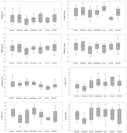 In detail, the weight values varied from 3.4 to 30.1 g measured in Albion and Monterey, respectively. Albion and Monterey, characterized by the lowest and highest weight, denote the lowest and greatest values of length, width, and thickness (L: 19.8 mm and 47.8 mm; W: 17.7 mm and 41.7 mm; and T: 15.9 mm and 37.9 mm; respectively). The shape index calculated from the L and W ratio ranged from approximately 0.74 to 1.84 (Favette and Irma, respectively). Fruit color coordinates showed high variability among the cultivars (L* ranged from 32.16 (Portola) to 45.91 (San Andreas), a* from 25.43 (Monterey) to 38.41 (San Andreas), b* from 12.85 (Cabrillo) to 29.68 (San Andreas)) (Figure 2). Similar physical traits’ variability among the cultivars was reported by other authors [37,38,39,40], but a comparison of these seven cultivars was not available in the literature data.