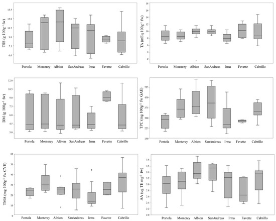 Dataset box plots: evaluation of the chemical traits variability in relation to the different cultivars. TSS = total soluble solid content; TA = titratable acidity; DM = dry matter; TPC = total phenolic content; TMA = total monomeric anthocyanins; AA = antioxidant activity.
