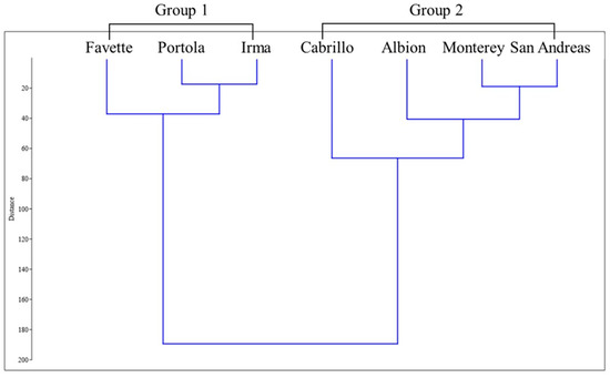 In detail, Favette (located in a separate sub-cluster), Portola and Irma (located in the same sub-cluster) were in the first group. The separation of the samples of these cultivars with respect to the other was probably due to the similar low mean values of TPC and AA (>300 mg GAE 100 g−1 FW, and >3 µg TE mg−1 FW, respectively). Moreover, Favette was discriminated in a sub-cluster probably due to the highest amount of TA (10 ± 1 mEq 100 g−1 FW) and TMA (26 ± 6 mg CGE 100 g−1 FW). The similar discrimination of cultivars in relation to the chemical characteristics was also reported by Ceccarelli et al. [35] in a previous work on cherry. The second group was characterized by Cabrillo, Albion, Monterey, and San Andreas. Cabrillo and Albion were divided in two distinct sub-clusters, whereas Monterey and San Andreas into another sub-cluster. Monterey and San Andreas, and then Albion, were probably placed as neighbors due to the genetic similarity between them (Monterey = Albion × Cal 97.85-6 and San Andreas = Albion × Cal 97.86-1) and due their similar TSS and DM values. These last two parameters also led cluster aggregation for currant berry, as described by Pluta et al. [48] and Mądry et al. [49].