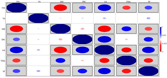 Pair correlations among the variables were also investigated using the color correlation graph (Figure 5). The size and the circle’s color depend on the correlation coefficient R. Blue indicates a positive correlation, whereas red indicates a negative correlation. Furthermore, the larger the circle, the greater the correlation. Figure 5 shows that TSS was significantly correlated with DM (R = −0.653; p ≤ 0.001), TPC (R = 0.335; p ≤ 0.001), TMA (R = −0.397; p ≤ 0.001), AA (R = 0.650; p ≤ 0.001), and FF (r −0.40; p ≤ 0.001), while no correlations were found among TA and all the parameters. Moreover, significant correlations were also found between DM and FF (R = −0.368; p ≤ 0.001), DM and TMA (R = 0.591; p ≤ 0.001), DM and AA (R = −0.645; p ≤ 0.001), TPC and AA (R = 0.125; p ≤ 0.001), TPC and FF (R = 0.456; p ≤ 0.001), TMA and AA (R = −0.489; p ≤ 0.001), TMA and FF (R = −0.451; p ≤ 0.001), and FF and AA (R = 0.626; p ≤ 0.001). As expected, most parameters were correlated with one another, as previously reported by Amoriello et al. [17]. On the contrary, Zitouni et al. [51] reported no correlations between the TPC and TMA or the TPC and AA. These differences could be explained by the different plant material used and by the size of the samples groups.