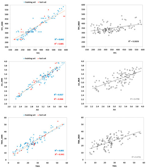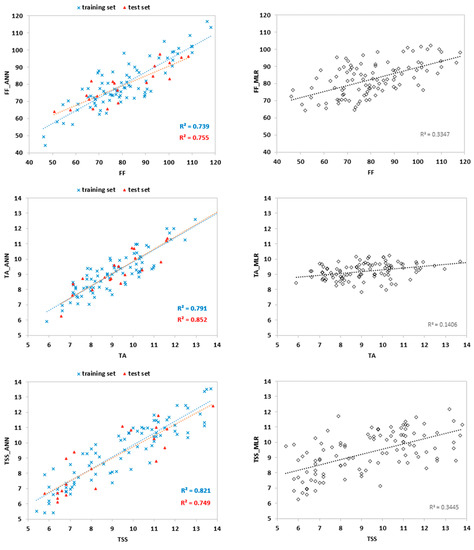 Predicted vs. experimental values of the flesh firmness (FF), total soluble solid content (TSS), titratable acidity (TA), total phenolic content (TPC), antioxidant activity (AA), and total monomeric anthocyanin (TMA) using the optimal ANN topologies and multiple linear regression (MLR). The coefficients of determination (R2) are reported.