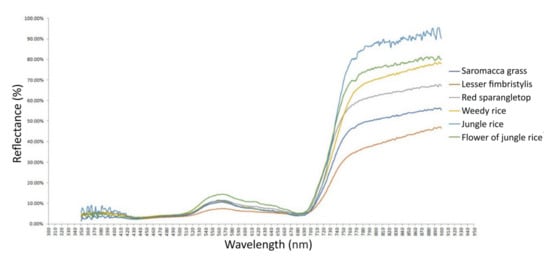 However, not all mobile applications in Table 1 used spectral signatures to detect pests and diseases. Weed is one of the components of pests and diseases. The specific characteristics of weeds can be visualized based on different wavelengths through spectral signature graphs. Hence, Roslin et al. [30] developed a new feature of the spectral signature library in mobile applications to differentiate and identify the location of weeds in the paddy field. The NIR reflectance values based on the spectral signature graph in order of highest to lowest are as follows: Jungle rice (Echinochloa spp.) > flower of jungle rice (Echinochloa spp.) > weedy rice (Oryza sativa L.) > red sparangletop (Leptochloa chinensis spp.) > saromacca grass (Ischaemum rugosum) > lesser fimbristylis (Fimbristylis miliacea) (Figure 1).