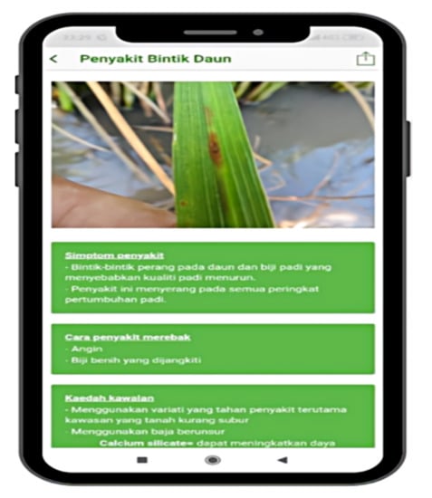 Additionally, Padi2U is another mobile application developed by integrating multispectral imagery. This application provides a list of pests, photos of the disease and symptoms, and suggestions on how to control pests and diseases in paddy [30]. The information is explained in Malay language and is a simple way for farmers to understand the messages (Figure 2; Table 2). The photos of symptoms could be used as a reference to diagnose pests and diseases in the field. In another web application, Mentha Mitra, intended for menthol mint growers, provides information on many diseases and pests (insect). Using the feedback tool, any disease that has not yet been digitised in the app and any insect pest that is unable to be identified by the farmers can be reported together with a photo and remarks for scientific advisories [31].