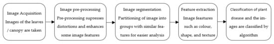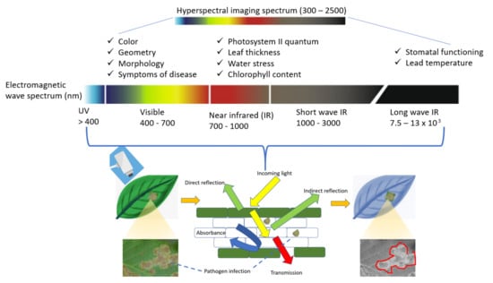 Based on Figure 4, visible light can be applied to evaluate variations in the colour and morphology of infected plant tissue. Changes in water content, leaf thickness, and photosynthetic efficiency could be detected using infrared and short-wave infrared, whereby long-wave infrared can be used to monitor plant surface temperatures. Multiple images are captured using hyperspectral sensors over its wavelength range of 300–2500 nm. Furthermore, imaging devices measure the absorption, transmission, and reflectance of input electromagnetic radiation interacting with the plant surface. Compared to healthy tissue, infected plant tissue generally has a lower reflectivity. Image analysis algorithms determine the contrast between diseased and non-diseased leaf areas [31].
