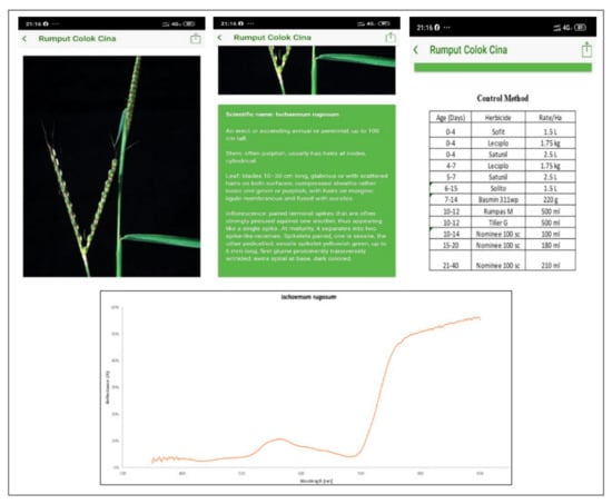 For instance, Roslin et al. [30] created a spectral signature graph of weeds, a common type of pest in rice fields, and developed a mobile application for the spectral signature of weeds. Using Master AppsBuilder, all spectral signatures were kept in a spectral database and displayed on smartphones. Figure 5 shows the website’s main menu, which includes a list of applications, and Figure 6 demonstrates the content of menus, pictures, a description, the control method, and a spectral signature graph. The main menu includes weed information, the spectral signature of weeds, and suggestions for weed control. Users can install the mobile application on their devices. The mobile application operates by displaying an image of the weed species, its general name, scientific name, description, a method of control using a chemical application, and a graph of the weed species’ spectral signature. This mobile application stores a database of weed information, including spectral signatures, and provides a spectral signature graph.