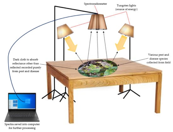 Initially, hyperspectral reflectance data and spectral signatures of pests and diseases should be collected. The task of spectrum data collection consists of two major steps, namely spectral sampling (Figure 7) and spectral library compilation. Throughout the spectral range, the white panel diffuses approximately ~99% of the incident light during the calibration process. Particularly, the white reference panel’s reflectance value is almost one for each wavelength [108]. Each pest and disease should be selected at random for 10 samples at a distance of 5 cm between the optical sensor and the sample. Hence, this method is used to avoid inaccuracy and noise when recording data [109].