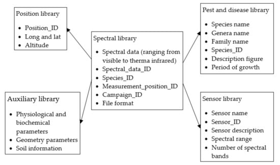 The purpose of developing a spectral library is to store the spectral data of the pest, identify the different disease severities in a large area, and provide an action plan for users to control pests and diseases. The spectral library also includes normatively measured and processed situation parameters of background information for the specified pest and disease species. The five components of the spectral library system are (i) a knowledge database, (ii) a measured spectral library, (iii) an auxiliary library, (iv) spectral analysis, and (v) an end-user application demonstration (Figure 8). Certain information, i.e., background knowledge on pest and disease species, could be identified in a knowledge database. Then, all of the calculated spectra of different species could be saved in the measured spectral library, and the auxiliary library can store several of the ancillary data of the species measured. The spectra gathered in the spectrum analysis could be pre-analysed to verify the accuracy of the library before it is used by end-users in practical tasks. Figure 8 presents an example of the data model of the Spectral Library System of pest and disease species.
