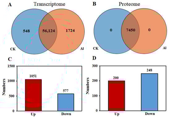 A statistical representation of the quantified transcripts and proteins. Venn diagrams for the quantified transcripts (A) and proteins (B) under Al3+ treatment (red) or CK (blue). The amounts of differentially expressed genes (C) and proteins (D).