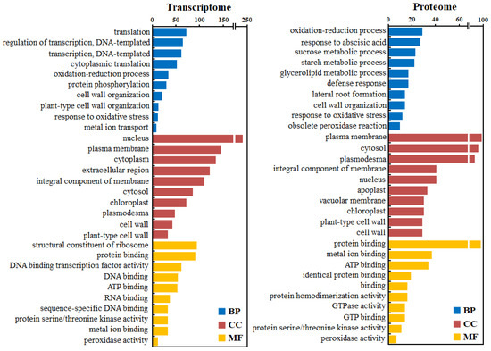 GO analyses of the differentially expressed genes and proteins. BP: Biological process; MF: Molecular function; CC: Cellular component.