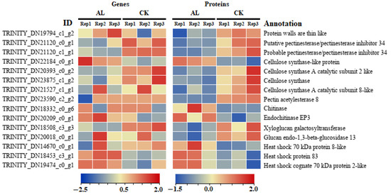 The DEPs relating to “cell wall synthesis” were selected for further analysis (Figure 4). The protein levels of most of the related proteins showed no significant changes under aluminum stress, however, the probable pectin esterase/pectin esterase inhibitor 34 (TRINITY_DN21120_c1_g1) and xyloglucan galactosyltransferase (TRINITY_DN18508_c3_g3) were both significantly downregulated by 1.16- and 1.01-fold, respectively. The levels of putative pectin esterase/pectin esterase inhibitor (TRINITY_DN21120_c0_g1 and TRINITY_DN21120_c1_g1), pectin acetyl esterase 8 (TRINITY_DN23590_c2_g2), and cell wall synthesis-related proteins (TRINITY_DN20393_c0_g2, TRINITY_DN23875_c1_g2, and TRINITY_DN21527_c1_g1) were significantly decreased compared to the control levels. Conversely, the levels of chitinase (TRINITY_DN18332_c0_g6) and end chitinase EP3 (TRINITY_DN20209_c0_g1) were significantly increased. Meanwhile, the protein levels of three heat-shock proteins (TRINITY_DN14670_c0_g1, TRINITY_DN18453_c3_g1, and TRINITY_DN19474_c0_g1) related to cell wall synthesis were similarly found to be significantly increased under the Al3+ stress. This observation suggests that these proteins play an important role in regulating the cell wall structure of the petals during Al3+ stress.