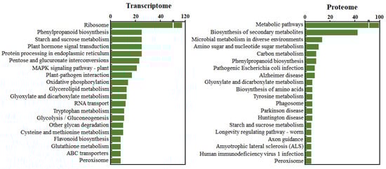 KEGG pathway analyses were performed to reveal the functions of the DEGs/DEPs that might be related to the Al3+ stress response. Pathway annotation results showed that 1628 DEGs and 449 DEPs were classified into 109 and 214 pathways, respectively. It was found that the DEGs were primarily enriched in the ribosome (106) (Figure 5). The DEPs were principally enriched in the metabolic pathways (80), followed by involvement in the biosynthesis of secondary metabolites (46) (Figure 5). Interestingly, many DEGs and DEPs were discovered to both be enriched in the peroxisome pathway. These results suggest that genes involved in the peroxisome pathway are connected to the Hydrangea macrophylla response to Al3+ stress.
