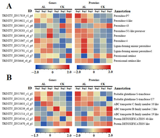 Anthocyanin transporters are important proteins that regulate anthocyanins. Here, seven DEPs related to anthocyanin transport were identified, including two glutathione S-transferase proteins (GSTs), three ATP-binding cassette (ABC) transporter proteins, and two detoxification (DTX) proteins (Figure 6B). Within these groups of differentially expressed proteins, two glutathione s-transferases (GST, TRINITY_DN17805_c1_g1 and GST U7, TRINITY_DN23131_c0_g1), one ABC transporter C family member 10-like (ABCC10, TRINITY_DN18633_c2_g7), and one detoxification protein (DTX 40, TRINITY_DN16544_c2_g5) were significantly upregulated following Al3+ stress. Conversely, three DEPs, including ABCB2 (TRINITY_DN20239_c0_g3), ABCB19 (TRINITY_DN21514_c3_g1), and DTX24 (TRINITY_DN21670_c0_g1) were significantly downregulated under Al3+ stress. The transcript level of only the GST gene was significantly upregulated compared with the corresponding CK level, which correlated to the change in protein level. Additionally, the expressions of ABCB19 and DTX24 were significantly downregulated, whereas no significant changes were illustrated in the other four genes.