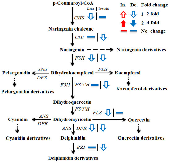The expression levels of genes related to the anthocyanin biosynthesis pathway were also significantly affected by the Al3+ treatment at the transcript and protein levels. The results showed that eight genes related to the anthocyanin biosynthesis pathway were significantly downregulated under Al3+ stress compared with the CK levels (Figure 7). These included the transcript levels of chalcone synthase (CHS, TRINITY_DN20366_c1_g6) and flavonol synthase (FLS, TRINITY_DN20628_c0_g9), which decreased significantly compared with the CK levels. However, the protein levels showed no significant changes. The transcript levels of the chalcone isomerase (CHI, TRINITY_DN16945_c0_g1), anthocyanidin 3-O-glucosyltransferase (BZ1, TRINITY_DN17786_c1_g6), and F3′,5′H (TRINITY_DN15745_c0_g3) genes did not significantly alter under Al3+ stress, yet there was a significant decrease in their protein levels. Moreover, both the transcript and protein levels of flavanone 3-hydroxylase (F3H, TRINITY_DN22725_c2_g5) and dihydroflavonol 4-reductase (DFR, TRINITY_DN18805_c2_g2) decreased significantly under Al3+ stress.