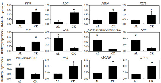 To validate the RNA-Seq results, qRT-PCR analysis was performed on 12 genes (PIN3, PIN1, PEI34, XLT2, FLS, AOP1, Ligin forming anionic POD, GST, Peroxisomal CAT, DFR, ABCB19, and DTX24) using gene-specific primers. The results demonstrated similar trends to the RNA-Seq data (Figure 8), thus confirming the reliability of the TPM values for each transcript that was previously determined by the RNA-Seq.