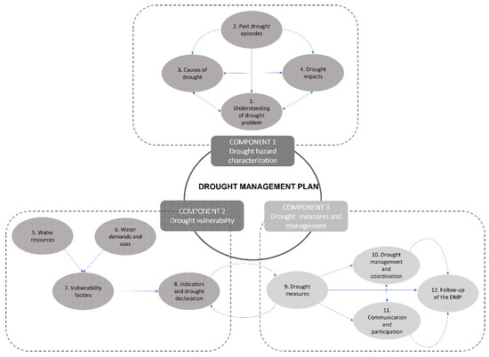 A conceptual framework was developed to organize and address relevant aspects for a DMP according to the literature on drought risk management (Figure 1). This includes three main components (drought hazard characterization, drought vulnerability and drought measures and management) originally proposed by Hayes et al. [11] and later adapted by Fu, et al. [24], WMO/GWP [14] and Vogt et al. [16]. In this framework, the first component looks at the hazard itself; the second characterizes the system exposed to the hazard, while the third component analyzes actions taken to minimize the impact of the hazard on the system.