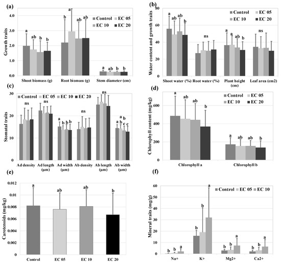 Variation across the control, EC05, EC10, and EC20 treatments for growth traits (a,b), shoot and root water content (b), stomatal traits (c), and photosynthetic pigments content (d,e), as well as across the control, EC05, and EC10 treatments for mineral traits (f). Ad, adaxial stomata; Ab, abaxial stomata. The different letter indicates a significant difference and ‘ns’ indicates no difference in salt treatments at p < 0.05, based on the Tukey–Kramer HSD method. The standard deviations are shown by the error bars.