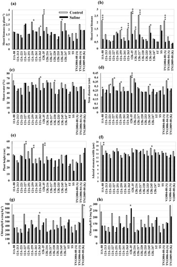 Variation in growth traits and shoot water content (a–e), stomatal (f), and chlorophyll (g,h) traits of 20 genotypes in control and saline treatments. The saline treatment includes combined EC10 and EC20 treatments for most growth (a,b,d) and all stomatal traits and only EC20 treatment for the plant height, shoot water, and chlorophyll traits. ‘A and K’ denote selections from cultivars Alamo and Kanlow; ST, salt-tolerant check EG1104-02; SS, salt-sensitive check PI 315723-1. *, **, and *** indicate significant differences of each of the genotypes in control versus salt treatments at p < 0.05, p < 0.01, and p < 0.001, respectively, based on a pairwise t-test.