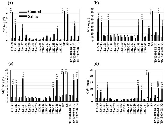 Variation in mineral composition traits (a–d) of 20 genotypes in control and saline (EC10) treatments. The saline treatment includes only EC10 treatment for the mineral traits. ‘A and K’ denote selections from cultivars Alamo and Kanlow; ST, salt-tolerant check EG1104-02; SS, salt-sensitive check PI 315723-1. *, ** and *** indicate significant differences of each of the genotypes in control versus salt treatments at p < 0.05, p < 0.01, and p < 0.001, respectively, based on a pairwise t-test.