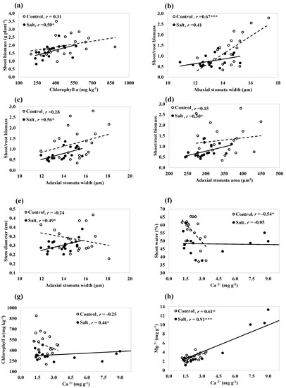 Correlation between growth, shoot water content, stomatal, photosynthetic, and mineral traits across 20 switchgrass genotypes, evaluated under control and saline treatments (a–h). The saline treatment includes combined EC10 and EC20 treatments for shoot biomass, the ratio of the shoot and root biomass, stem diameter, adaxial stomata width, adaxial stomata area, and abaxial stomata width, with only the EC20 treatment for shoot water and chlorophyll a and only the EC10 treatment for Mg2+ and Ca2+. * and *** indicate correlation coefficient (r) values significant at p < 0.05 and p < 0.001 levels of significance.