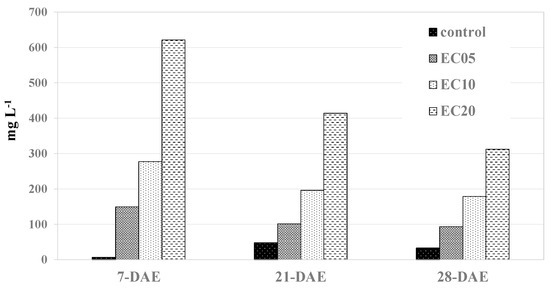 With the application of the first salt treatment, or seven days after the experiment (DAE), the average solute content in the leachate water was 6, 149, 278, and 621 mg L−1 in the control, EC05, EC10, and EC20 treatments, which was higher than the greenhouse water (3 mg L−1) (Figure 5). The solute concentration in the leachate water increased from 7 to 21 DAE in the control treatment, and it decreased from 21 to 28 DAE. However, the solute concentrations decreased from 7 to 28 DAE in the EC05, EC10, and EC20 treatments. Decreased solute concentrations in the leachate water at the later stage of the experiment could be due to the formation of a thin layer of solutes on the surface of the soil, and sensitivity to application of solutes decreased with decreasing soil macro-porosity [30].