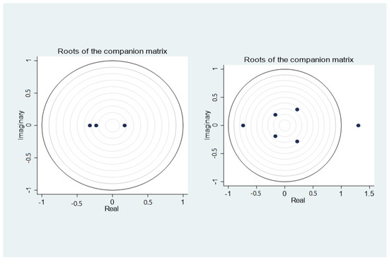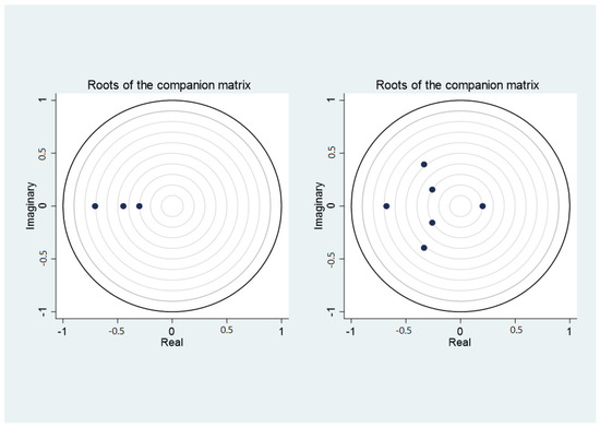 Stationarity test of the PVAR model (the left is the second-order difference first-order lag, and the right is the second-order difference second-order lag).