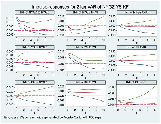 In Table 6, the first row on the left gives the Wald test of whether the coefficients of 1 lag period of the business environment (YS) in the PVAR equation are jointly 0. The p-value is 0.006, thus rejecting the null hypothesis that the coefficients of the two lags of the business environment (YS) are jointly 0. Thus, it can be considered that the business environment (YS) is the Granger of Agricultural Quality Development (NYGZ). The second row on the left gives the Wald test of whether the coefficients of the two lags of agricultural opening-up (KF) in the PVAR equation are jointly 0. According to the corresponding p-value of 0.759 in Table 6, it cannot be considered that the agricultural opening-up (KF) is the Granger of the agricultural high-quality development (NYGZ). The third row on the left gives the Wald test of whether the coefficients of the two lag periods of all other endogenous variables in the PVAR equation are jointly 0. The p-value is 0.005; thus, the business environment (YS) and agricultural opening-up (KF) together can be considered the Granger of the high-quality development of the agricultural economy (NYGZ). We can make a similar interpretation for the other equations in Table 6; see Table 6 for details.