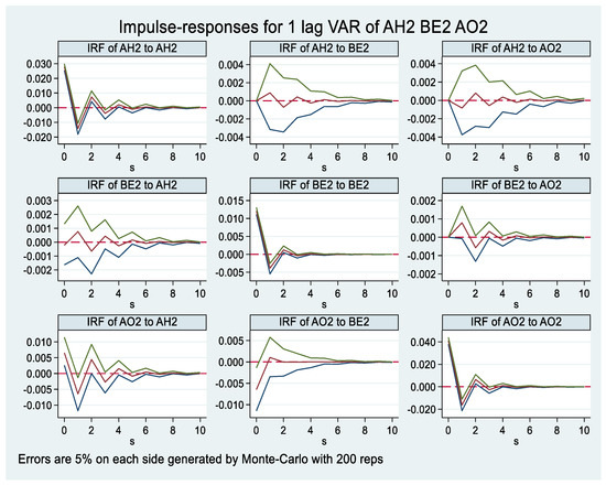 After removing the individual characteristics of the business environment (BE2), under the impact of one of its own pulses, it gradually reached the highest positive response in the first period, but then the effect continued to decrease in waves, and began to gradually decrease in the sixth period. Under the impact of a pulse from AH2 and AO2, BE2 gradually increased first, but then it continued to decrease, and then the effect continued to decrease in waves and gradually converged to 0 in the tenth period.