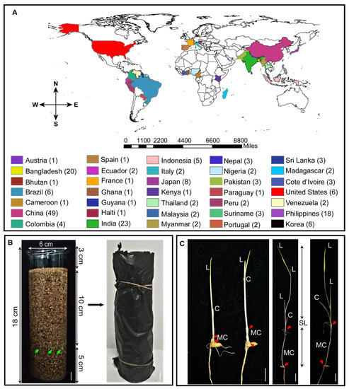 Figure 1. Germplasm distribution and an improved mesocotyl elongation assay. (A) The worldwide distribution of 190 rice cultivars. Different countries with the number of cultivars are represented with different colors. (B) The sowing method in which green arrows are representing seeds. (C) Diversity in 10-day-old seedling parameters. Left picture representing indica and japonica, respectively, while the other two pictures representing Aus group. Red arrows showing mesocotyl elongation. C, coleoptile; L, leaves; MC, mesocotyl; Bars = 1 cm.