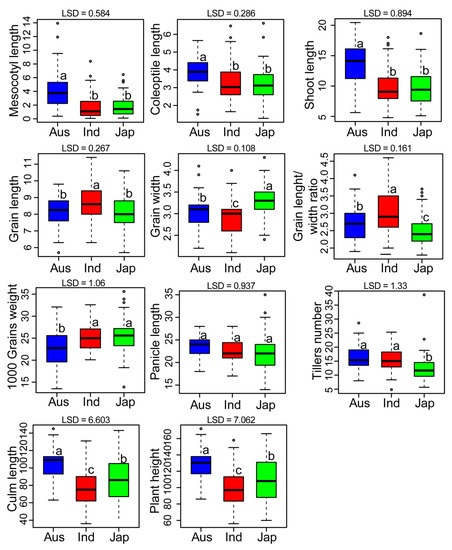 Figure 2. Comparison of 11 agronomic parameters between Aus, Indica (Ind), and Japonica (Jap) groups. Boxplots represent the median (middle line), error bars, and outliers (dots). LSD was used for statistical test. Different letters (a, b and c) above the column differs at p < 0.05.
