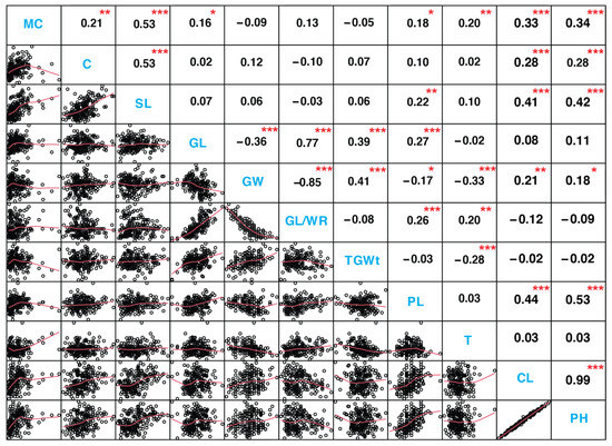 Pearson’s correlation analysis was conducted to study the association among seedling and maturity-related traits (Figure 3). Seedling-related traits MC and C played a significant role in seedling emergence. Results indicate that they showed highly significant and positive correlation with SL (r = 0.53 *** and r = 0.53 ***, respectively) and showing the scope of simultaneous improvement of these parameters [17]. SL showed positive and highly significant association with PL, CL, and PH (r = 0.22 **, 0.41 ***, and 0.42 ***, respectively) (Figure 3). PH exhibited a highly positive correlation with all parameters except GL/WR and TGWt. Seedling parameters such as SL (r = 0.42 ***), MC (r = 0.34 ***), and C (r = 0.28 ***) and maturity parameters CL (r = 0.99 ***) and PL (r = 0.53 ***) showed highest positive correlations with PH (Figure 3). While, GW had a lowest positive but significant (r = 0.18 *) correlation with PH. The parameters studied at seedling stage showed highly significant association among themselves and proved a strong relation with maturity-related traits. These findings elaborated that those seedlings of greater vigor could perform better at later stages.
