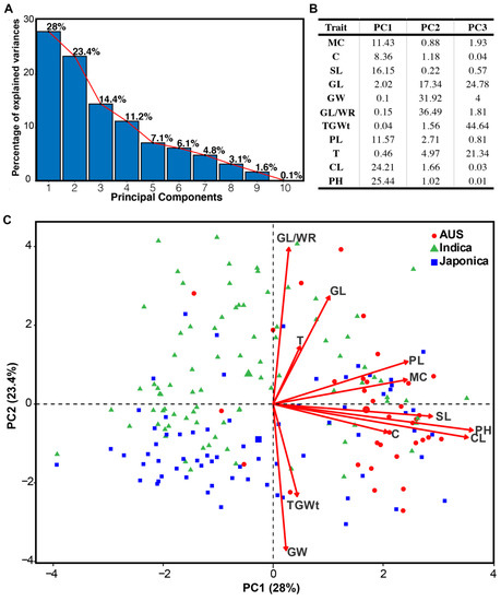 A principal component analysis (PCA) was performed to analyze the variations and associations of agronomic parameters among the 190 cultivars of different groups originated from different countries of the world. Rice cultivars were scattered in biplots by groups, with agronomic parameters shown as vectors (Figure 4). The first three PCs accounted for 65.8% of the total variability (Figure 4A). Variation in PC1 is mainly attributed to PH, CL, SL, C, MC, and PL for which the eigenvalues are 25.44%, 24.21%, 16.15%, 8.36%, 11.43%, and 11.57%, respectively. While variation is attributed by GL/WR (36.49%), GW (31.92%), and GL (17.34%) (Figure 4B) in the PC2. PC3 was highly related to TGWt (44.64%), GL (24.78%), and T (21.34%) (Figure 4B). Moreover, Indica and Japonica cultivars were more diverse compared with the Aus group (Figure 4C) [47]. This conserveness might be related to a higher seedling emergence of Aus cultivars.