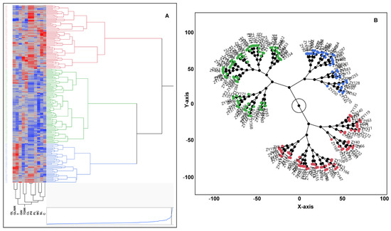 Different kinds of analytical analysis are available for the estimation of diversity among the cultivars. In this study, Hierarchical Cluster Analysis (HCA) and Constellation Plot Analysis (CPA) were used to estimate diversity among the rice cultivars (Figure 5). Such analysis provides a better distribution of cultivars under the different environments as well as different groups of cultivars in the same environment. Results indicated that the rice cultivars distributed into three (Aus, Ind and Jap) distinct classification groups and each group further divided into two sub-groups. Group 1 (Aus) showed the highest values for most of the traits such as C, MC, SL, PL, T, CL, and PH. Among these groups, Group 2 (Japonica) performed poorly for all traits except GW and TGWt. Similarly, the third group (Indica) performed better for GL and GL/WR (Figure 5A). The Constellation Plot also indicates that the cultivars distributed into three groups (Figure 5B).