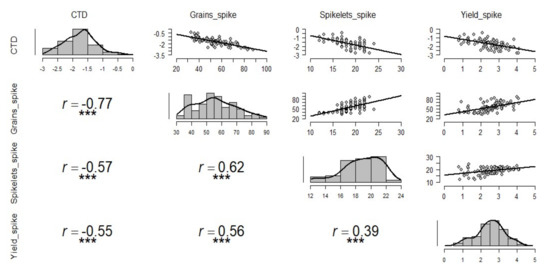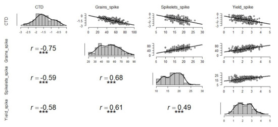 The CTD had a significantly high and negative correlation with all the spike traits indicating that cooler canopy is related to better yield. The number of spikelets, the number of grains, and grain yield per spike were highly correlated under all treatments (Figure 2). The number of grains spike−1 showed a strong correlation with CTD (r = 0.75) whereas spikelets spike−1 and yield spike−1 showed moderate correlations of r = 0.59 and r = 0.58, respectively. Besides observed correlations across all treatments, we also examined the correlations between yield components and CTD for each treatment separately. Under non-stressed condition, a similar relationship was observed among different yield components and CTD (Figure 3); under drought conditions, correlations between yield components and CTD were lower (Figure S1) than those evaluated across treatments (Figure 2), non-stressed (Figure 3), and late sown (Figure S2). Interestingly, the correlations between yield components and CTD in late sown treatment (Figure S2) were higher than those recorded in all other treatments except for the correlation between CTD and number of grains per spike in combined treatments (Figure 2), and under non-stress condition (Figure 3).