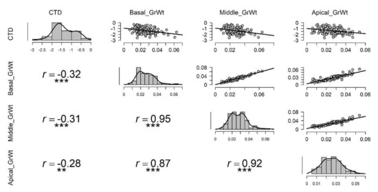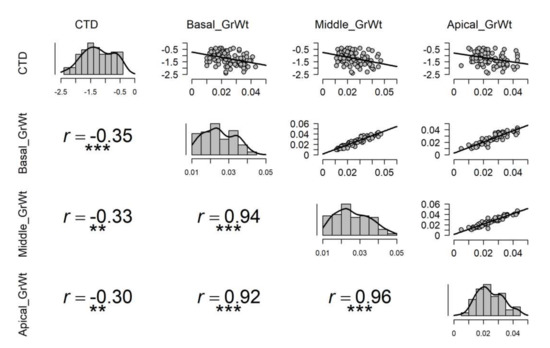 Under high temperature stress, cooler canopies were significantly correlated to the overall average grain weight of spike, and the highest correlation was with basal part average grain weight (r = −0.35), followed by middle (r = −0.33), and apical (r = −0.30) grain weight in a spike (Figure 4). Under the non-stressed condition, only the basal grain weight was significantly correlated with CTD (r = −0.18) (Figure S4). Under control or non-stressed condition, highly significant correlations were observed between the basal part of the spike with the middle and apical part atr = 0.95 and r = 0.87, respectively (Figure S4). A similar relationship was also observed between the apical and middle parts of the spike with r = 0.93 (Figure S4). Under drought conditions, no significant correlation was observed between CTD and grain weight of any part of the spike (Figure S3); however, highly significant correlations were seen among grain weights at different parts of the spike as seen in non-stressed (Figure S4) and late sown treatments (Figure 4). In late sown treatment, correlations between CTD and basal, middle, and apical part of the spike were significant with r = −0.35, r = −0.33, and r = −0.30, respectively (Figure 4).