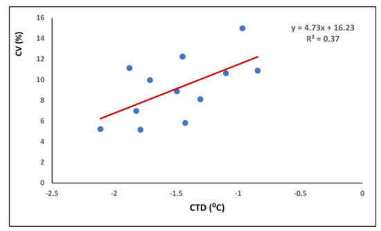 The average coefficient of variation (CV) of grain weight across the spike length calculated for each genotype across treatments and environment ranged from 5.17 to 14.99%. It was found to be associated with canopy temperature as those genotypes, which could keep their canopy cooler relative to others, and had less variation in grain weight within the spike (Figure 6). The data indicated that each degree of canopy warming could cause approximately 5% increase in variation in grain weight within the spike.